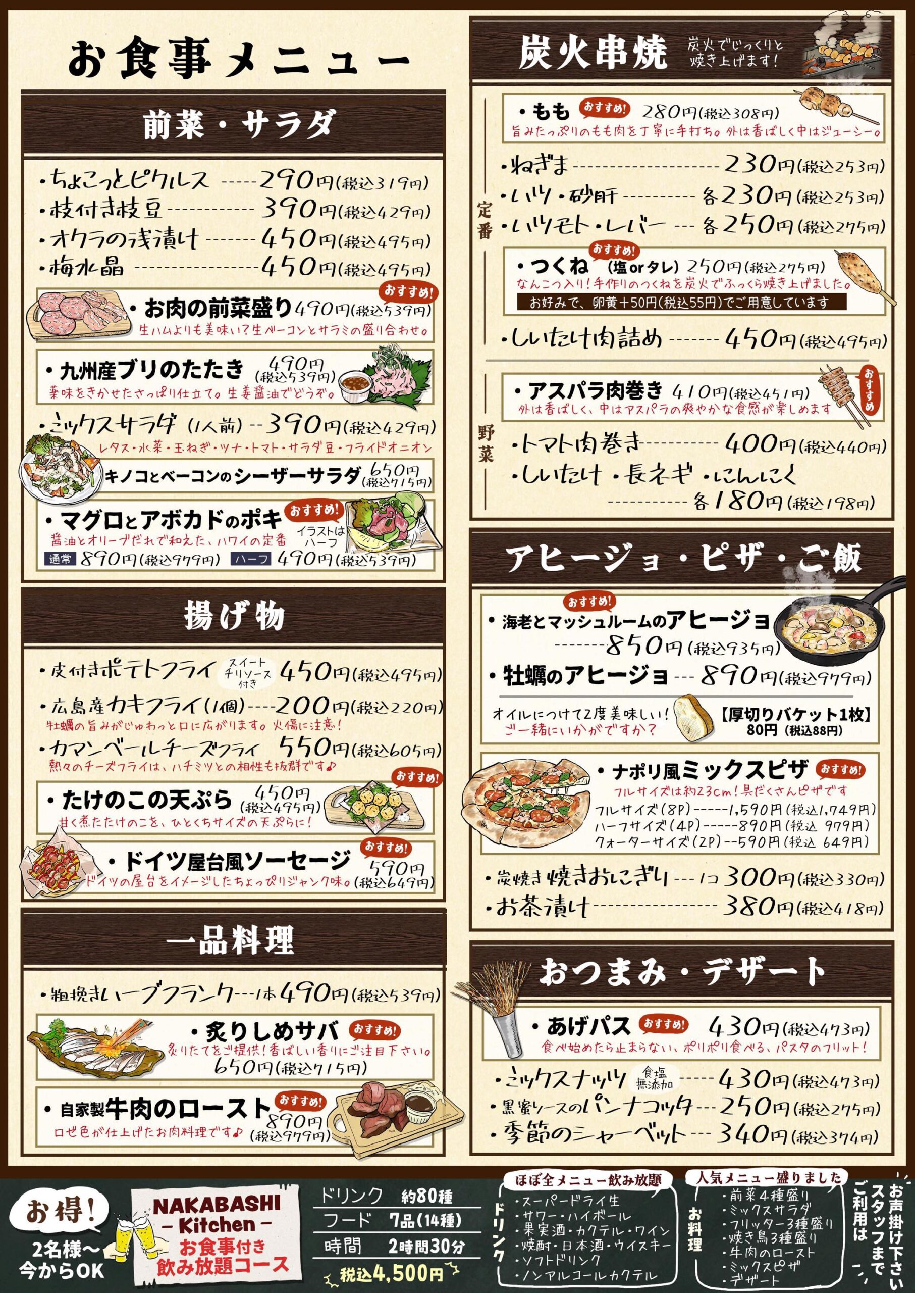 炭火でじっくり焼いた串焼きやピザなど、約40種類の豊富なお食事メニュー。ぜひお楽しみ下さい!